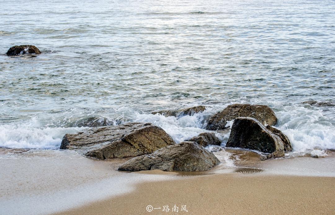沙滩上点缀着形状、大小不一的礁石,阵阵海浪从远至近袭来,激起层层浪花,好像在奏响激昂的交响乐。