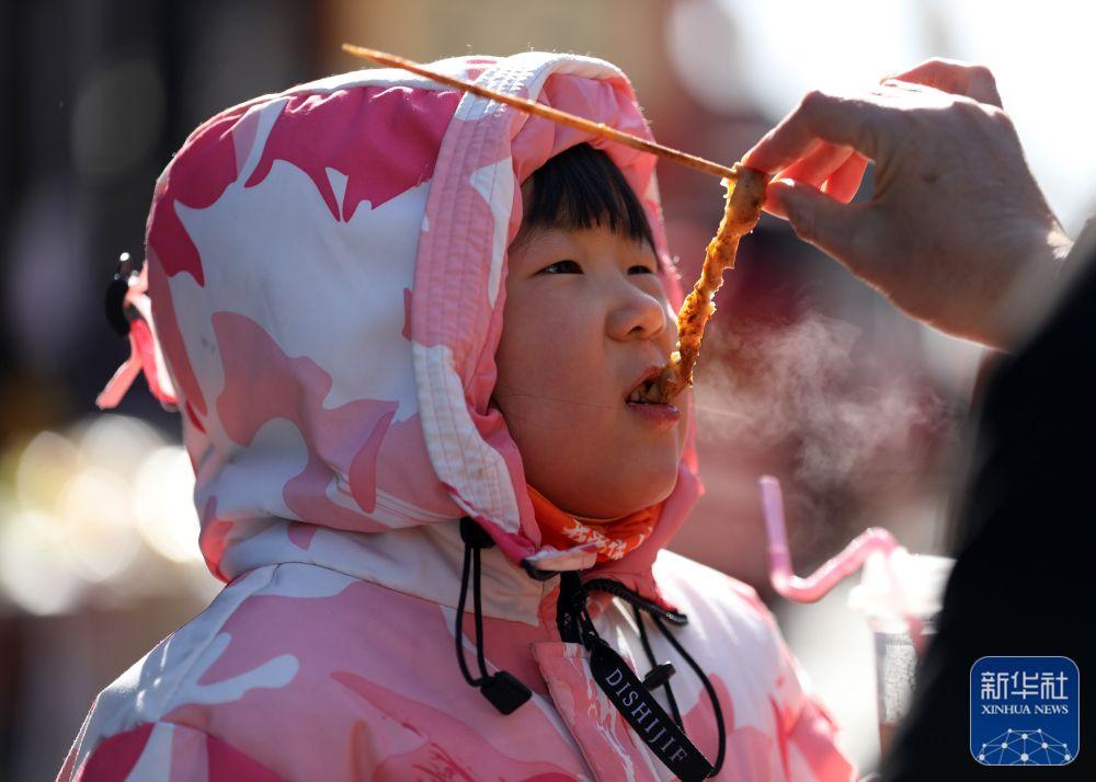 1月24日,在山东省临沂市郯城县郯国古城景区美食街,一名小女孩在品尝美食。新华社发(张春雷 摄)