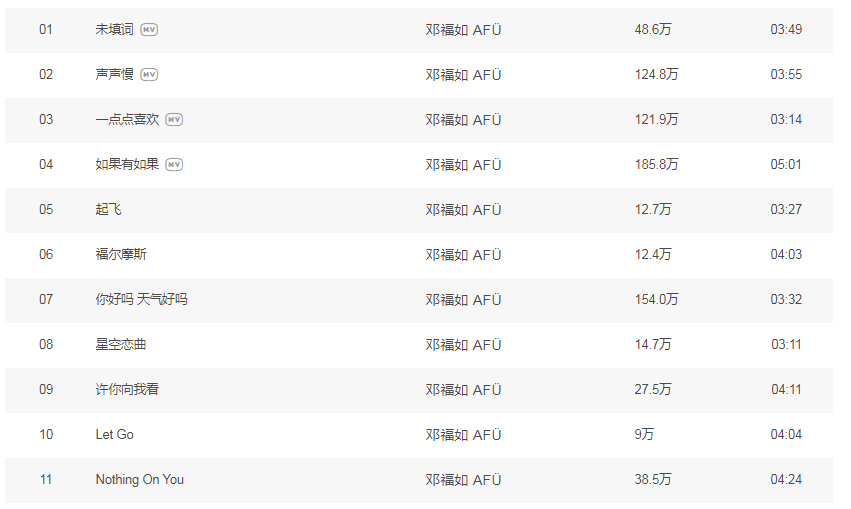 虽然小编想把每一首都发出来...因为每一首都是经典啊!!!尤其专辑中的《一点点喜欢》和《如果有如果》也被选中作为影视剧片尾曲。邓福如随后在新加坡举行的“原来如此音乐会”,获音乐制作人李伟菘现身到台上表示支持。在香港歌唱比赛《超级巨声3》与参赛者合唱作品《如果有如果》,获评审陈洁灵赞赏“很有福气可以听到阿福唱歌”, 而另一评审在他的音乐专栏表示,受邓福如的歌声和她创作的《如果有如果》打动。填词人曾纪诺也认为邓福如拥有令人赞叹的歌声,及近乎完美的和唱技巧。